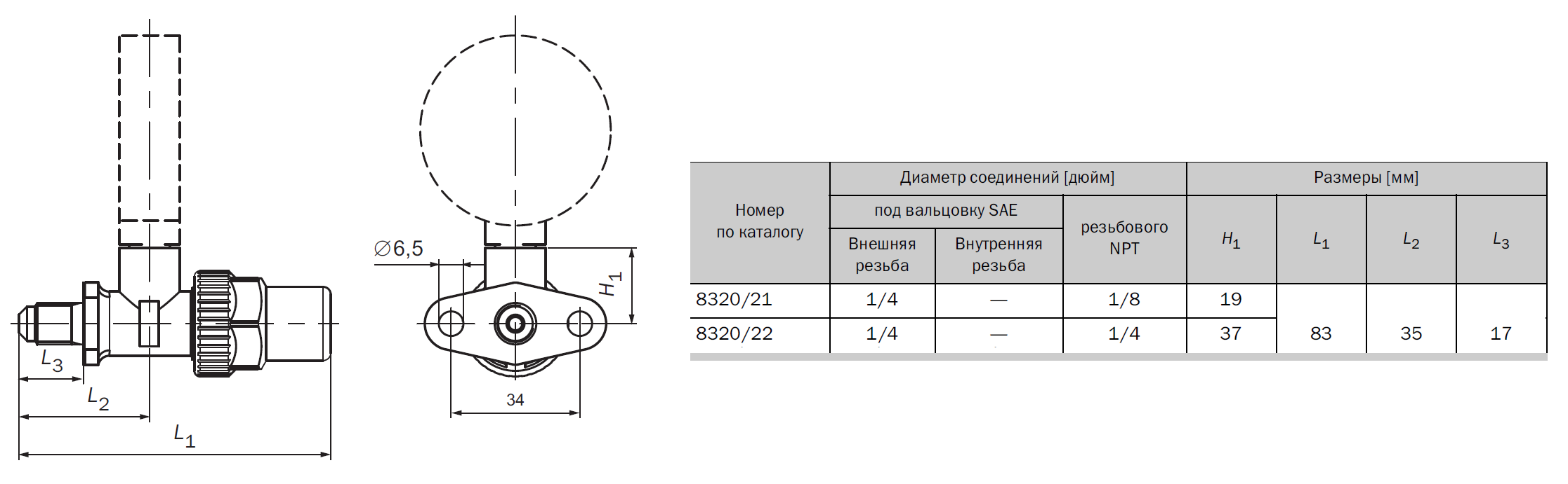 Клапан серії 8320 обладнаний невеликим фланцем для кріплення клапана на панелі управління і з'єднанням для установки датчика / манометра NPT.