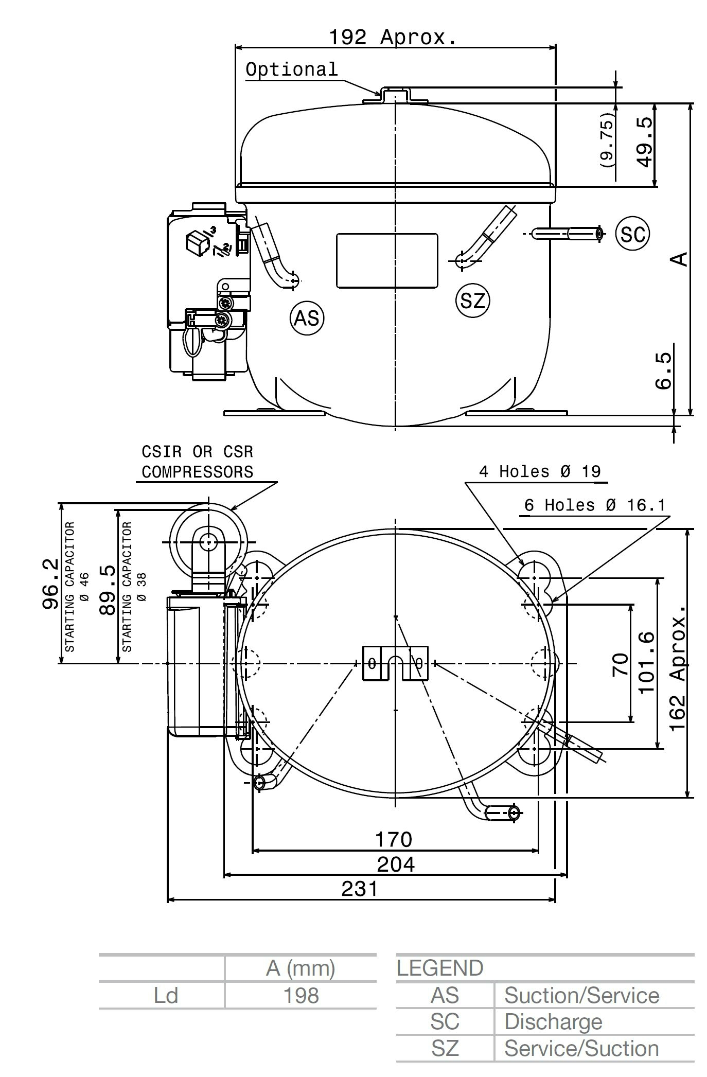 Тип двигуна CSIR (Capacitor Start -Induction Run) - це двигун з високим пусковим моментом. Використовує пусковий конденсатор. Пускова обмотка відключається після пуску. Стандартна енергоефективність. СреднеВисокотемпературние (HMBP) компресори працюють в діапазоні температури кипіння: від -25 до +10 ?C.