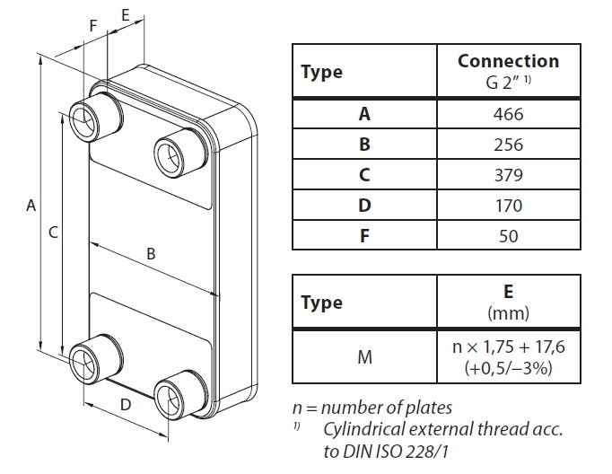 Среда - вода/гликолевый раствор с концентрацией до 50%. Тип пластин - M. Объем одного канала - 0,158 литр. Площадь поверхности теплообмена одной пластины - 0,105 м2. Тип присоединения - наружная трубная резьба по DIN ISO 228/1. Размер присоединения G 2 A. Длина патрубков - 50 мм. Материал пластин - нержавеющая сталь EN 1.4301 (AISI316L). Материал припоя - медь.