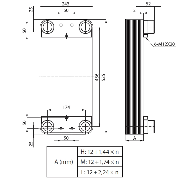 Среда - вода/гликолевый раствор с концентрацией до 50%. Тип пластин - H. Объем одного канала - 0,14 литр. Площадь поверхности теплообмена одной пластины - 0,117 м2. Тип присоединения - наружная трубная резьба по DIN ISO 228/1. Размер присоединения G 2 A. Длина патрубков - 52 мм. Материал пластин - нержавеющая сталь EN 1.4404. Материал припоя - медь.