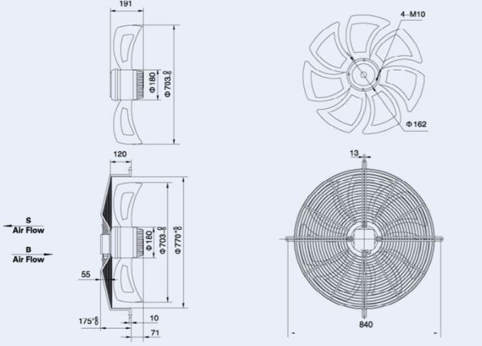5. Направление воздуха: S - всасывание, B - нагнетание