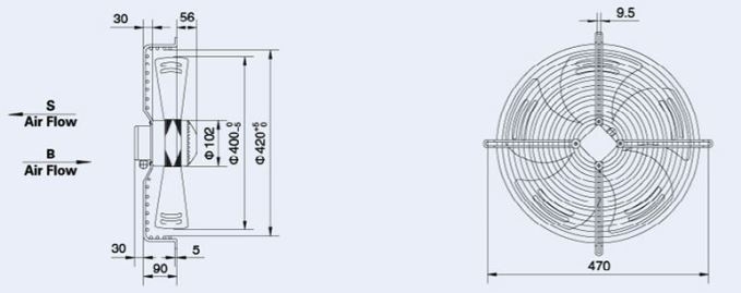 5. Направление воздуха: S - всасывание, B - нагнетание