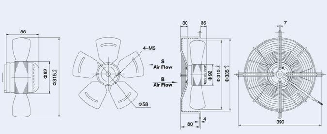 5. Направление воздуха: S - всасывание, B - нагнетание