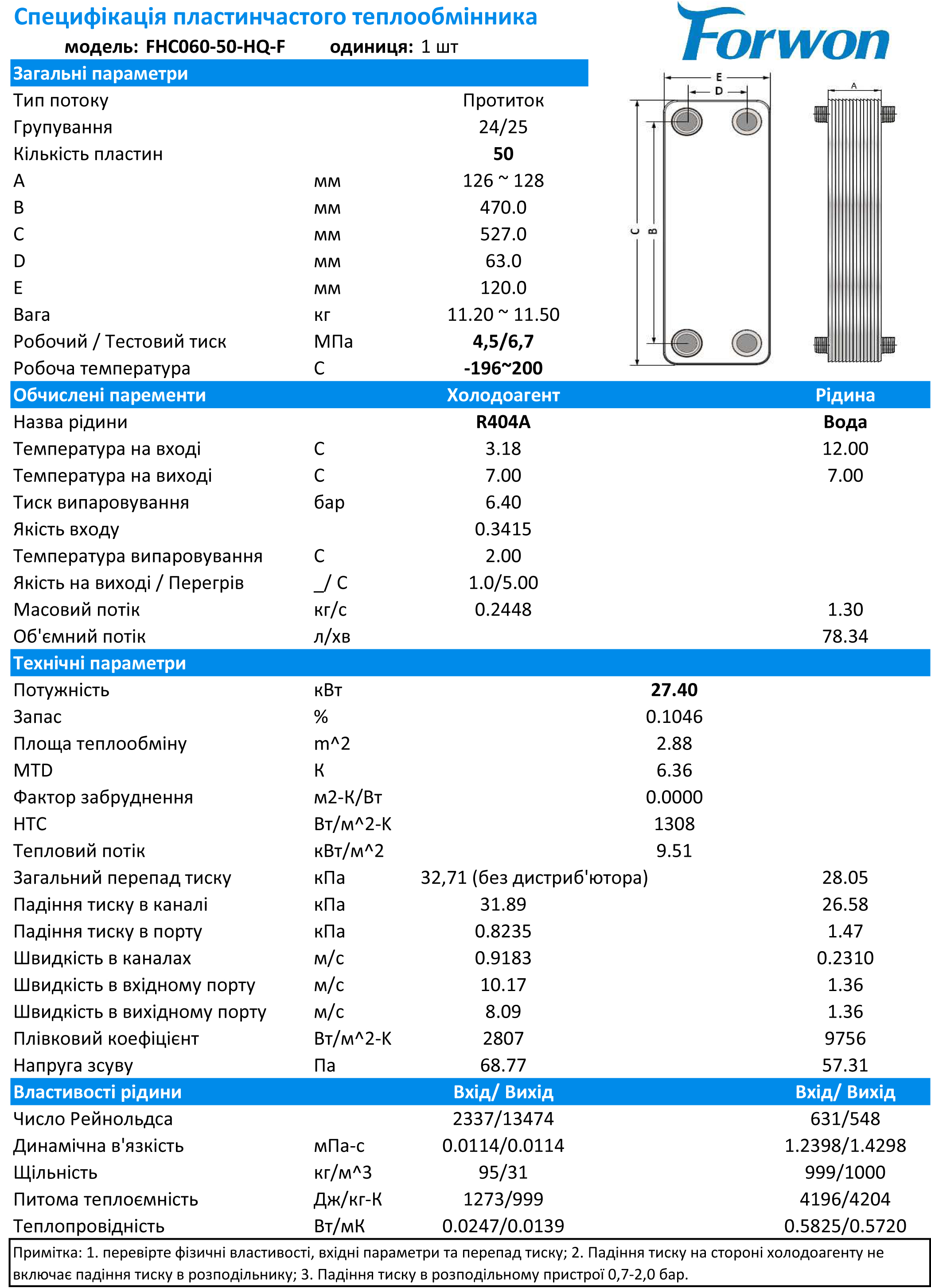 FHC060-50-F - 27,40 кВт (R-404a: +2/+40 - (H22.3/H35.3), Вода: +12/+7 - (G1"1/4)), 45 БарПластинчастий теплообмінник Forwon FHC060-50-F— компактне та енергоефективне рішення для систем охолодження та опаленняМодель Forwo... Читати далі...